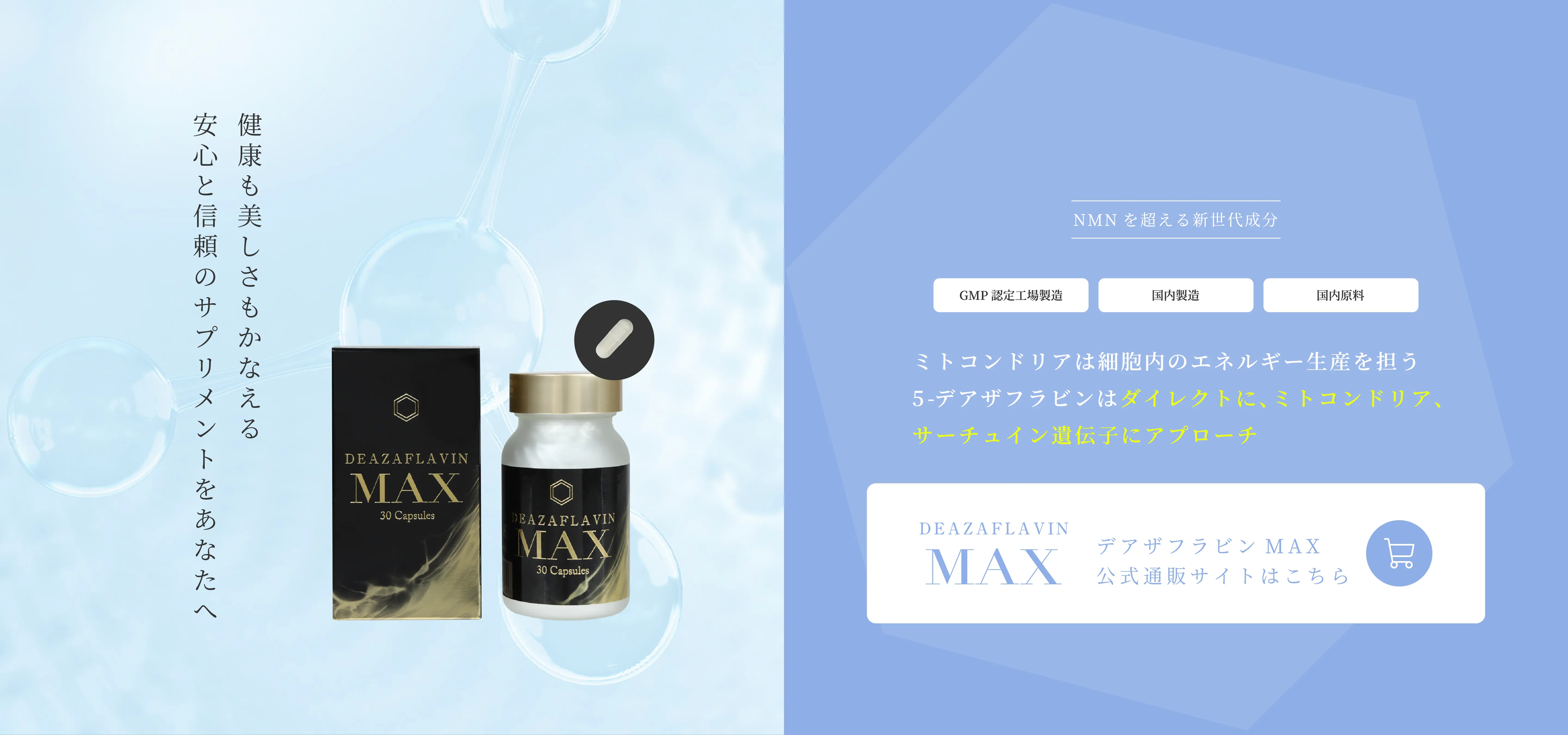 先進のエイジングケア成分として注目の「NMN」を超える新成分「5-デアザフラビン」を配合。更に2つの美肌新成分を配合したデアザフラビンMAX 新商品誕生